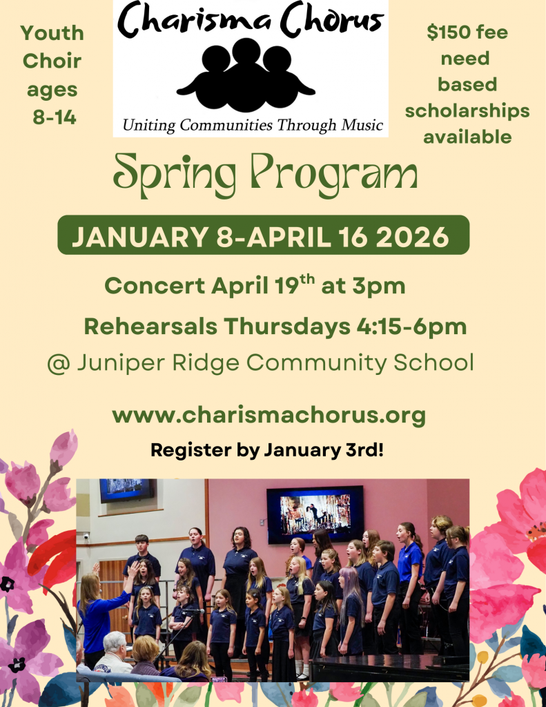 Our spring program this year runs from January 8-April 16th 2025 on Thursdays from 4:15-6pm. This program includes snacks from 4:15-4:30, then choral rehearsals, games and activities, vocal solo opportunities, and choreography/movement opportunities. It culminates in a concert on Sat. April 19th at 3pm at First Presbyterian Church.