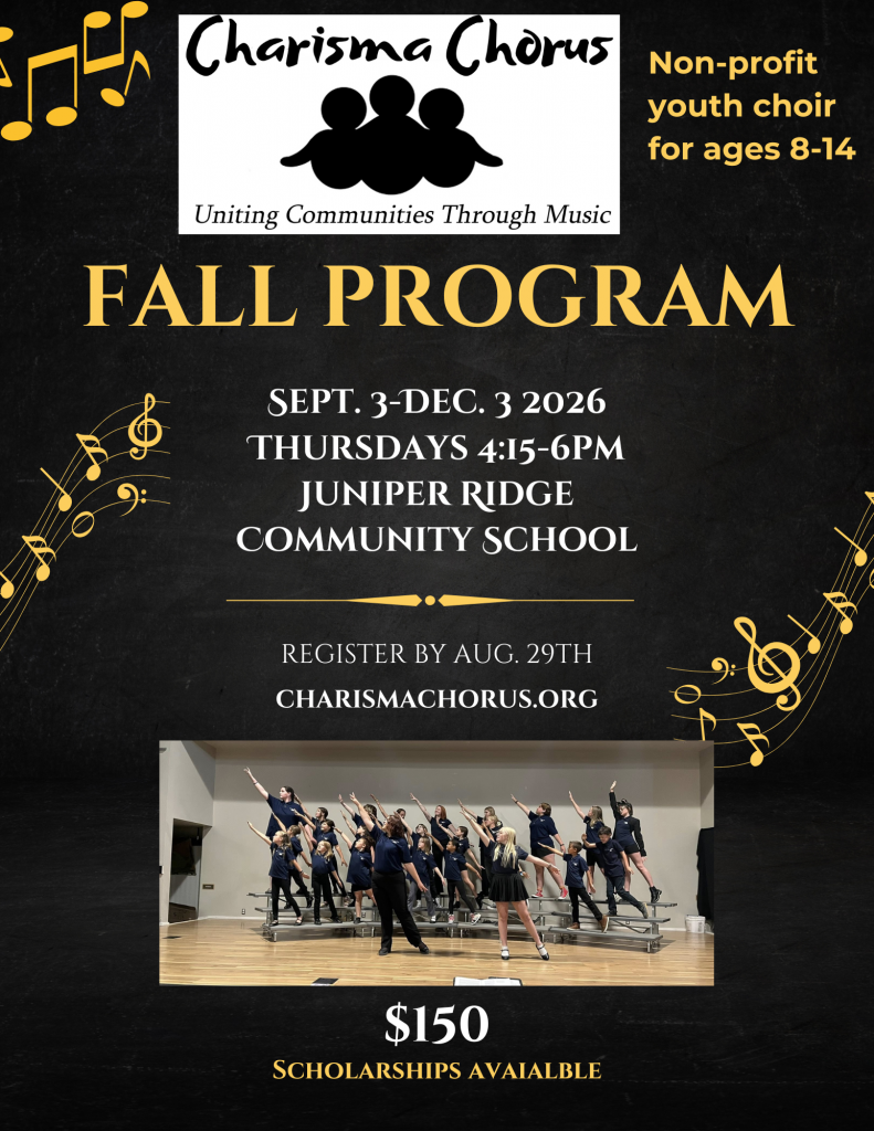 Our fall program this year runs from September 3-Decemeber 3 2026 on Thursdays from 4:15-6pm. This program includes snacks from 4:15-4:30, then choral rehearsals, games and activities, vocal solo opportunities, and choreography/movement opportunities. It offers the opportunity to sing the Colorado Choral Director’s concert in November and could possibly include performances at Palisade Parade of Lights, and a combined concert with Mariachi San Jose de los Santos, dates TBA!