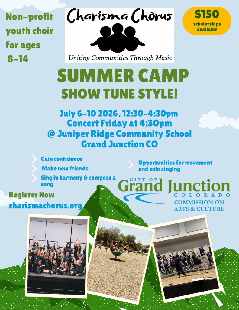 Our summer camp in Grand Junction, CO is Monday-Friday July 6-10 from 12:30-4:30pm. This program consists of choral rehearsals, games and activities, vocal solo opportunities, a break for snacks (provided) from 3:15-3:30, choreography/movement opportunities, and the chance to compose a song. It culminates in a concert on July 10th at 4:30pm and the opportunity to sing 2-3 pre-show performances for &Company’s summer musical theater production.